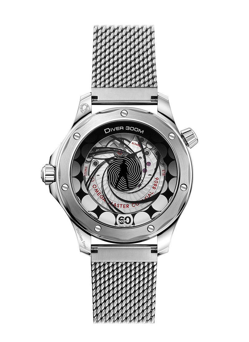 If you flip it over, the exhibition case back shows Bond’s silhouette and the iconic rifling of the gun barrel under the sapphire crystal. There’s also a printed 007 over 60 badge. It runs on a Calibre OMEGA 8806 self-winding movement with a 55-hour power reserve. The Steel on Steel Seamaster Diver 300M ships with a stainless-steel mesh bracelet with a fold-over clasp.