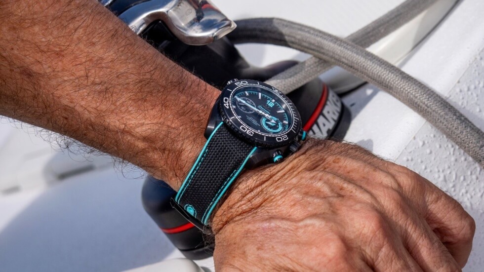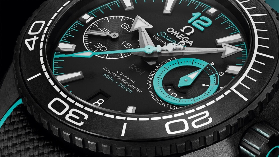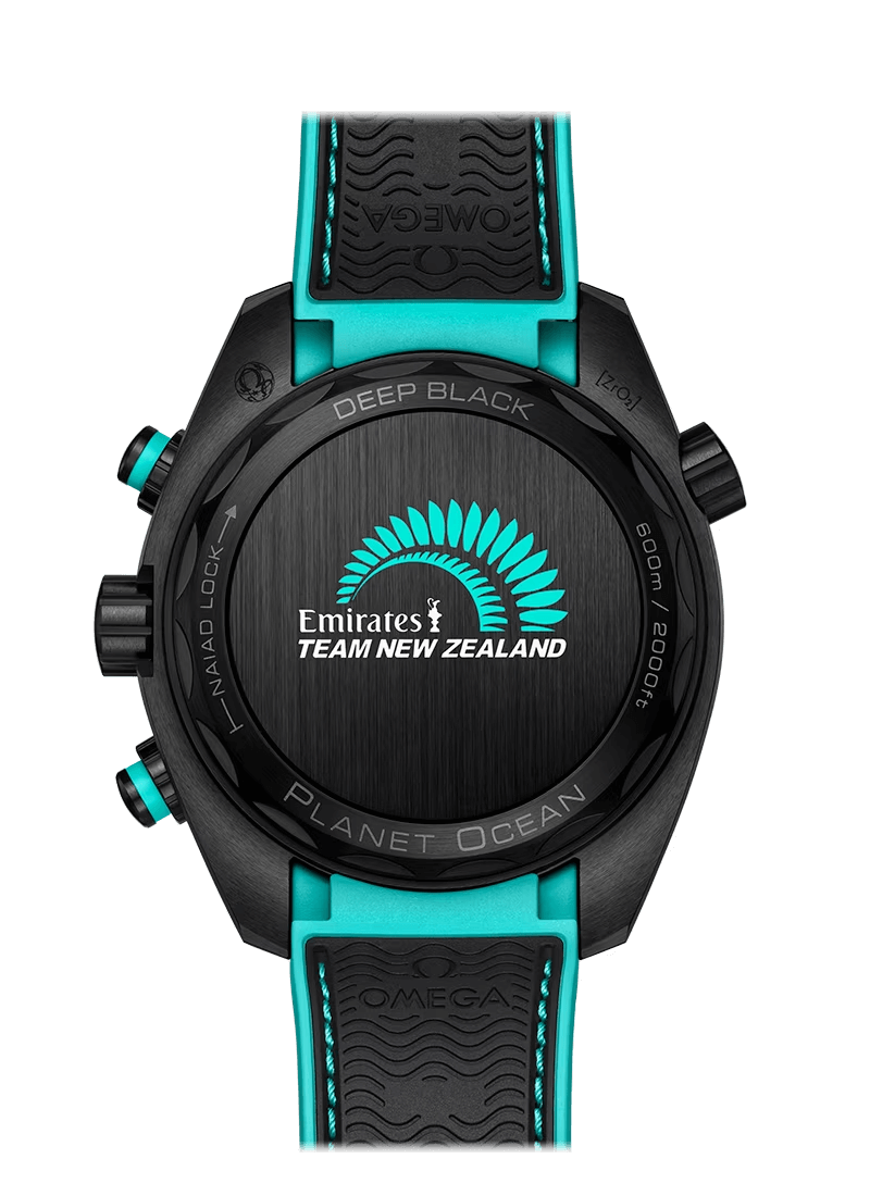 OMEGA endows the surfaces with a brushed finish to add an exquisite satin sheen. Meanwhile, contrast comes from the white enamel diving scale of its uni-directional rotating bezel, white Super-LumiNova coating on the baton hour markers and hands, with a splash of vibrant turquoise elsewhere for good measure. This chromatic combination is tastefully executed and enhances the ETNZ Deep Black’s aesthetic appeal.