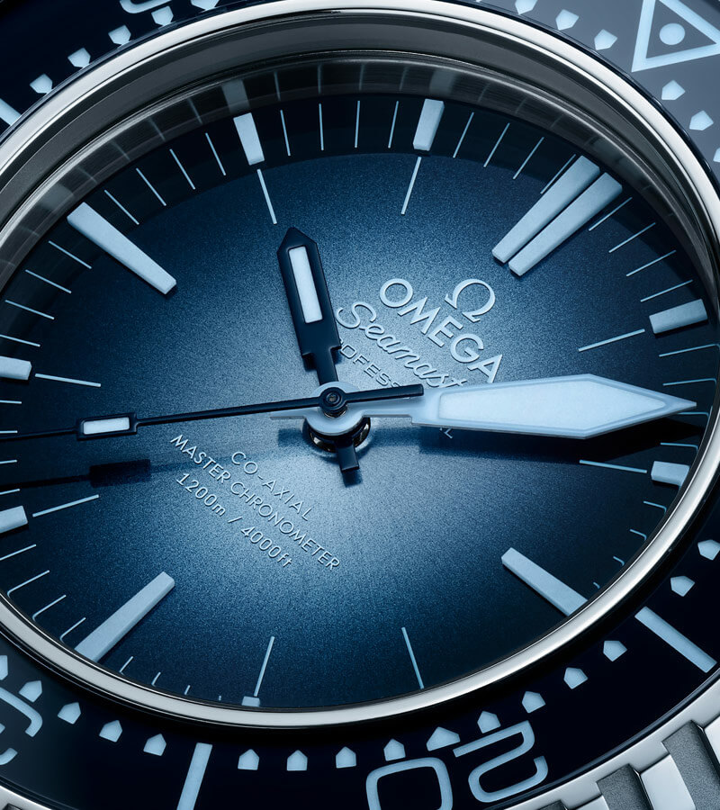 The bi-directional rotating bezel is fitted with a sapphire insert which covers a blue backdrop with the diving scale coated in light blue Super-LumiNova. This frames a sapphire crystal with anti-reflective treatments on both sides over a Summer Blue gradient dial.