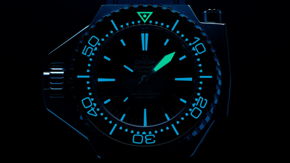 The Ploprof’s lumed baton hour markers and hour hand glow light blue in the dark, while the minute hand is green. OMEGA positions the screw-down crown and its guards to the left which designates this as a destro diver’s watch. A helium relief valve also finds its way to this version.
