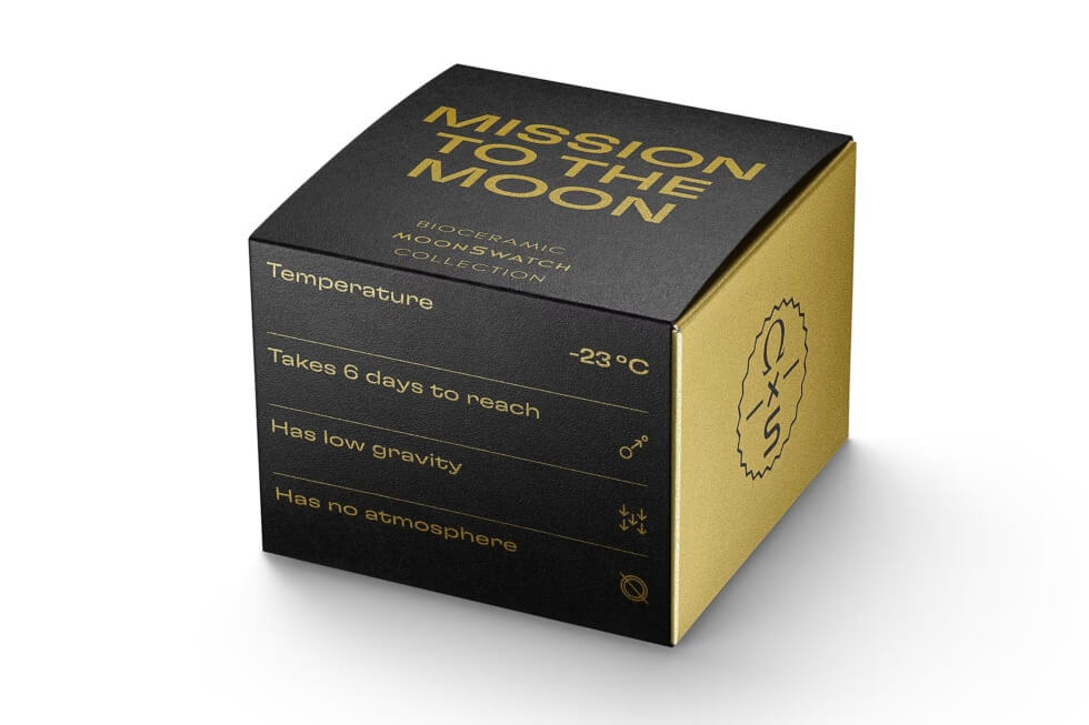 Overall, everything looks the same as the Speedmaster Mission to the Moon version of the MoonSwatch. The chronograph features a tachymeter bezel that frames a black dial with the OMEGA and Swatch co-branding at 12 o’clock. It’s also running on a quartz movement and is paired with a fabric strap that uses a Velcro closure system. The Speedmaster Mission To Moonshine Gold ships with a certificate of authenticity inside its presentation box.