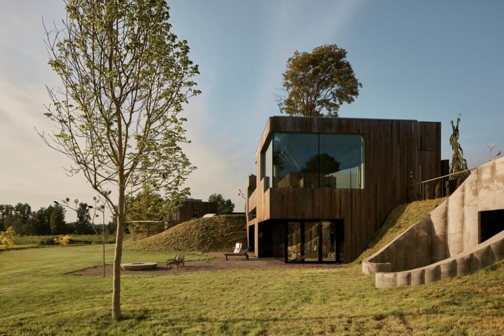 Canada-based artist and designer Omer Arbel built this family home on a hayfield in the Canadian Pacific Northwest called the 75.9 as an extension of its landscape. The home features a unique architecture comprising of large lily-pad shaped columns connected by pathways covered with lush grass so it blends with its green oasis.