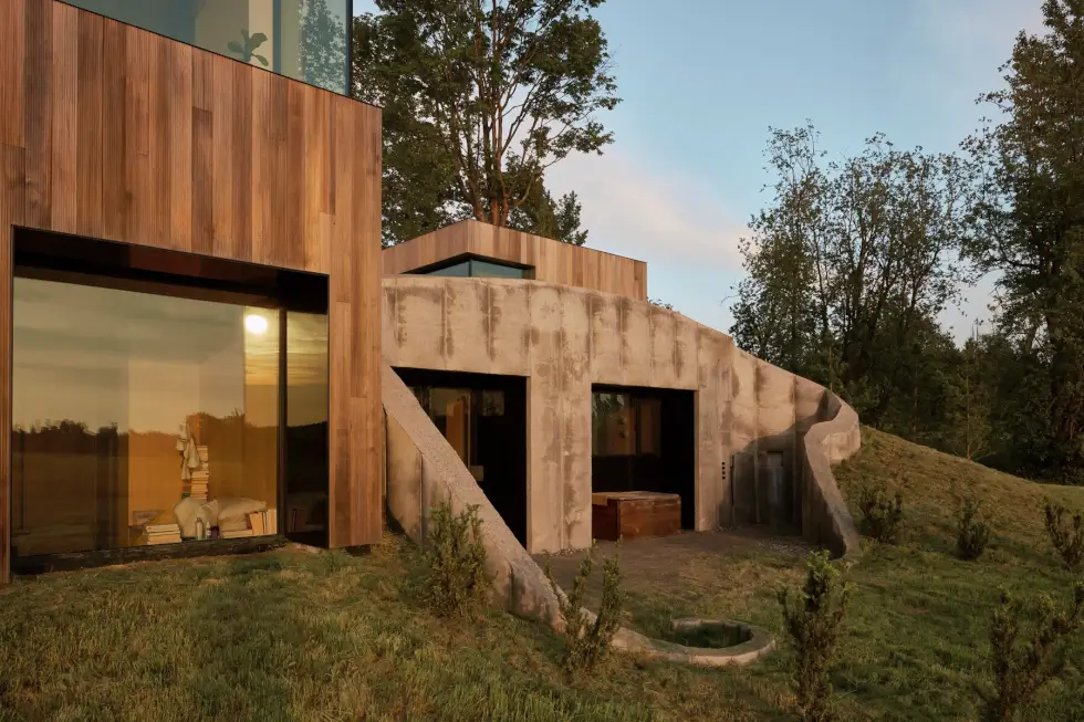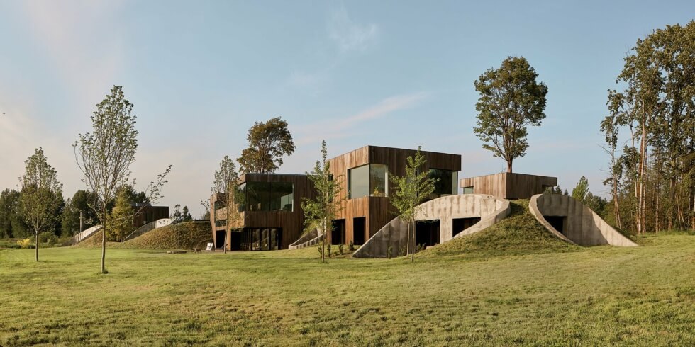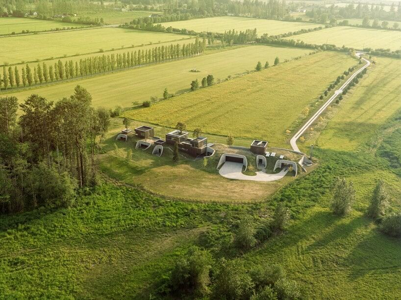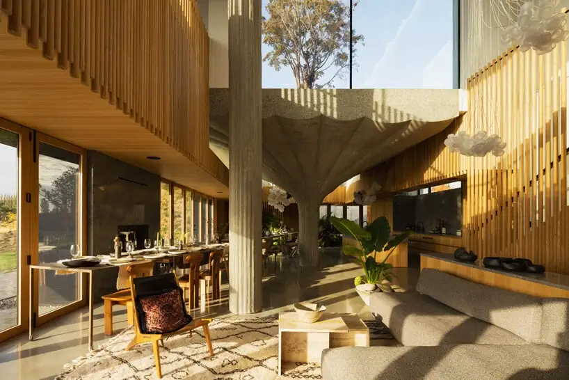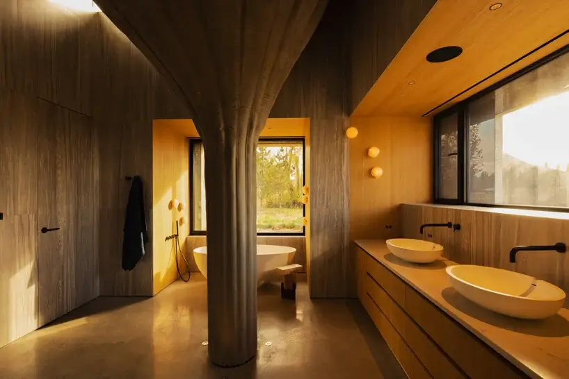 “The fabric formed concrete elements are treated as if they were found archeological ruins in the hay field landscape, with the house considered a contemporary construction built around and among them. Differing height and position for each column creates a cinematographic narrative of domestic habitation. The trumpet shape of each column is hollow, allowing planting of mature trees on the inhabited roofscape,” Arbel said of 75.9