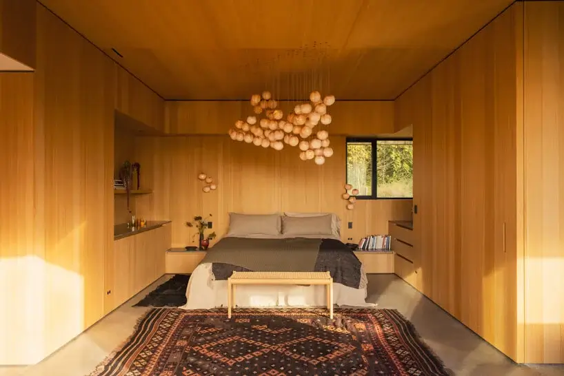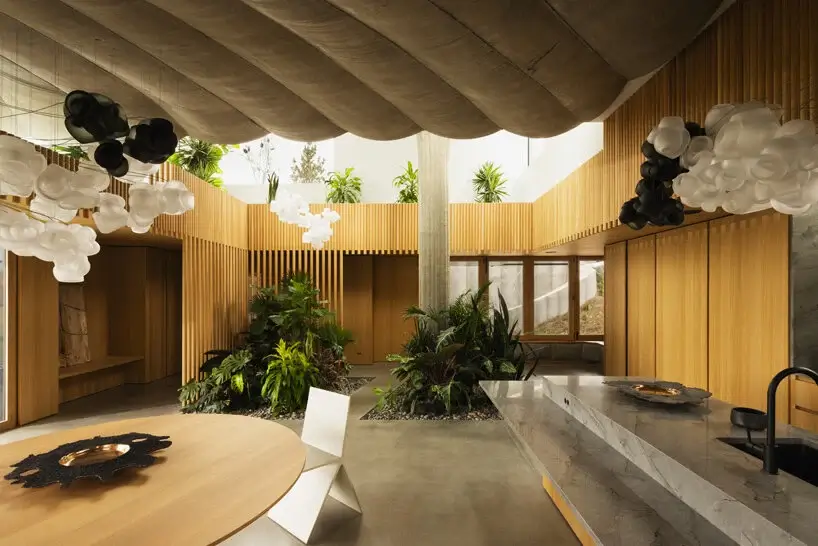 Meanwhile, four double-height volumes made of glass and cedar wood flock the living room and the hollows created by these columns have been planted with Magnolia trees on the roof. The dining space and kitchen are also set under one of these columns. Interior design exudes warmth using timber fixtures, Bocci lighting fixtures, and a Japan-inspired indoor garden.