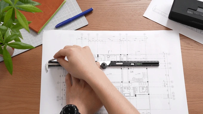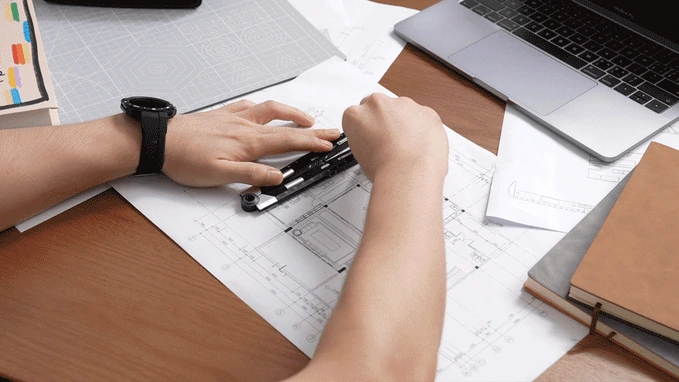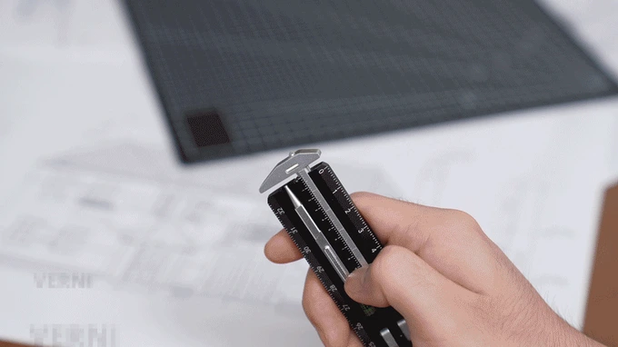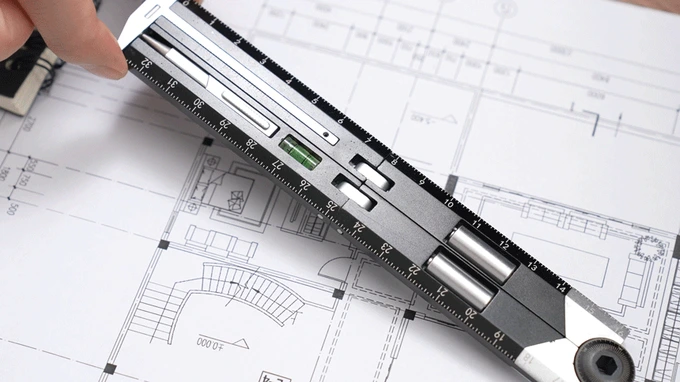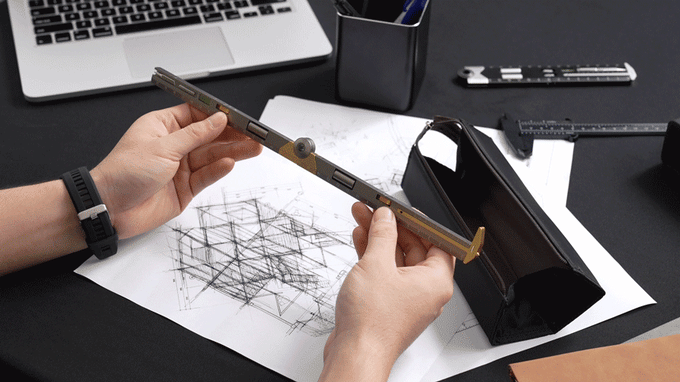 It’s just the size of a cigarette lighter at 3.2″ long when folded. But it unfolds to a full 12.75″ long to reveal a professional drawing ruler offering four functional modules: measurement, drawing, cutting, and positioning. It extends via aerospace-grade aluminum hinges with titanium alloy bearings. The bearings stay tight even after 10,000x opening and closing tests.