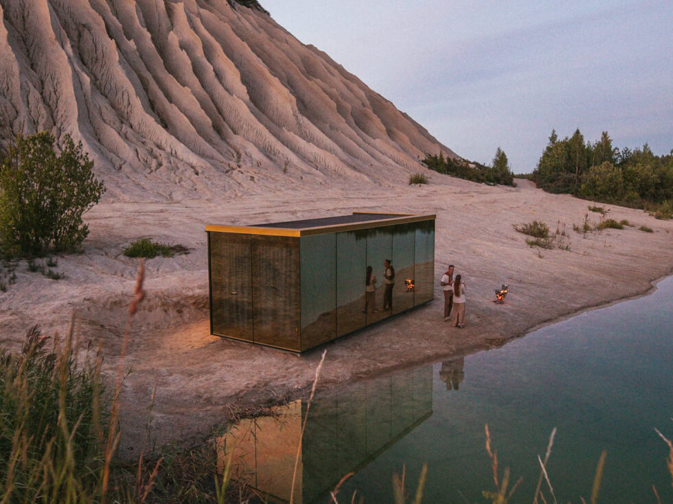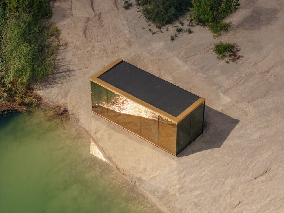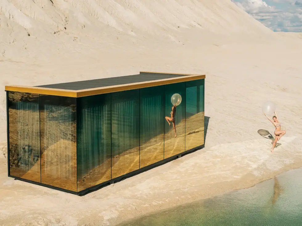 Fully immerse in nature with this stunning rectangular ADU featuring gold-shimmering glass facade exclusively produced for ÖÖD. The glass changes its golden glow throughout the day and according to the seasons, making the house blossom with each passing season. It reflects the golden summers, the falling leaves in autumn, the winter-sun and the spring flowers.