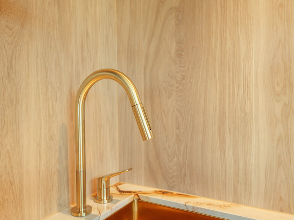 The turnkey Golden House is 7.9 meters long (25ft) and 3.33 meters wide (10ft). It has spacious headspace at 3.13 meters and is occupies a floor area of 283 square feet (26.3 sq m). Even the bathroom feels cozy. It features a golden-themed interior finished in high-end designs and custom products from the prestigious London brand, Buster & Punch.
