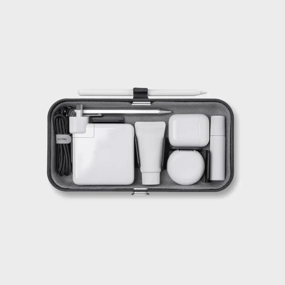 The Orbitkey Nest V2 opens like a book via a unique dual-function hinge that doubles as a pen loop. The foam padded interior safeguards your tech gear and is deeper than the original Nest. This way, it can hold bigger items like power chargers (MacBook charger), a mouse, and more.