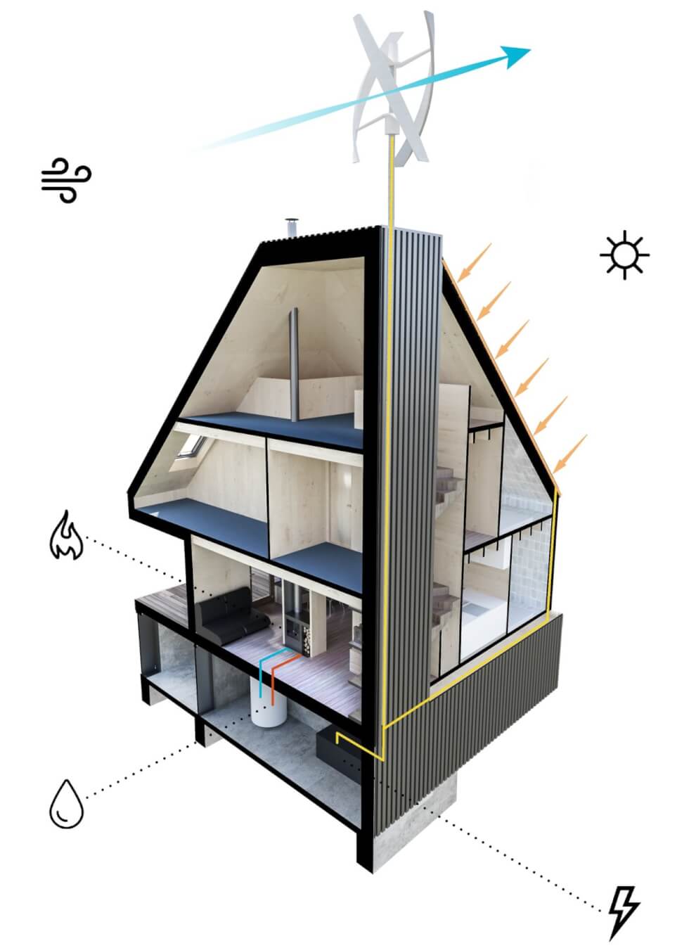 The Ore Mountain Chalet can sleep at least ten people, runs on electricity, and equipped with connection points for the rooftop photovoltaic system and for vertical wind turbines for a self-sufficient living.