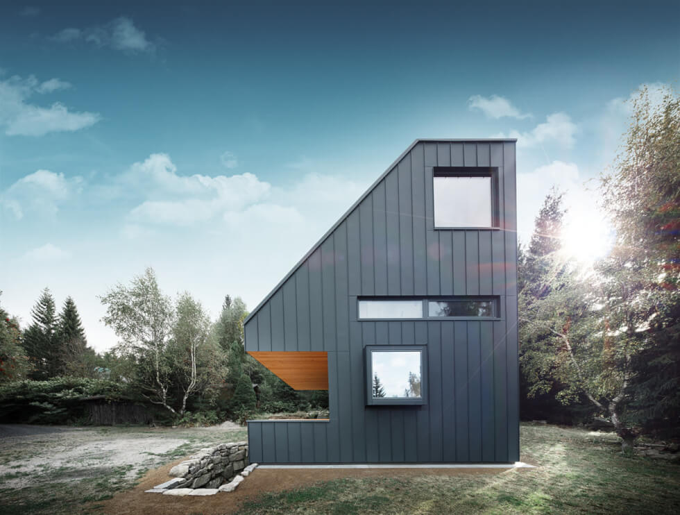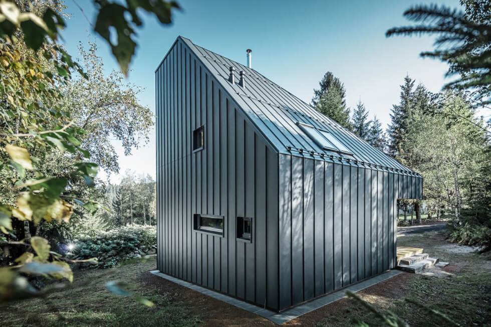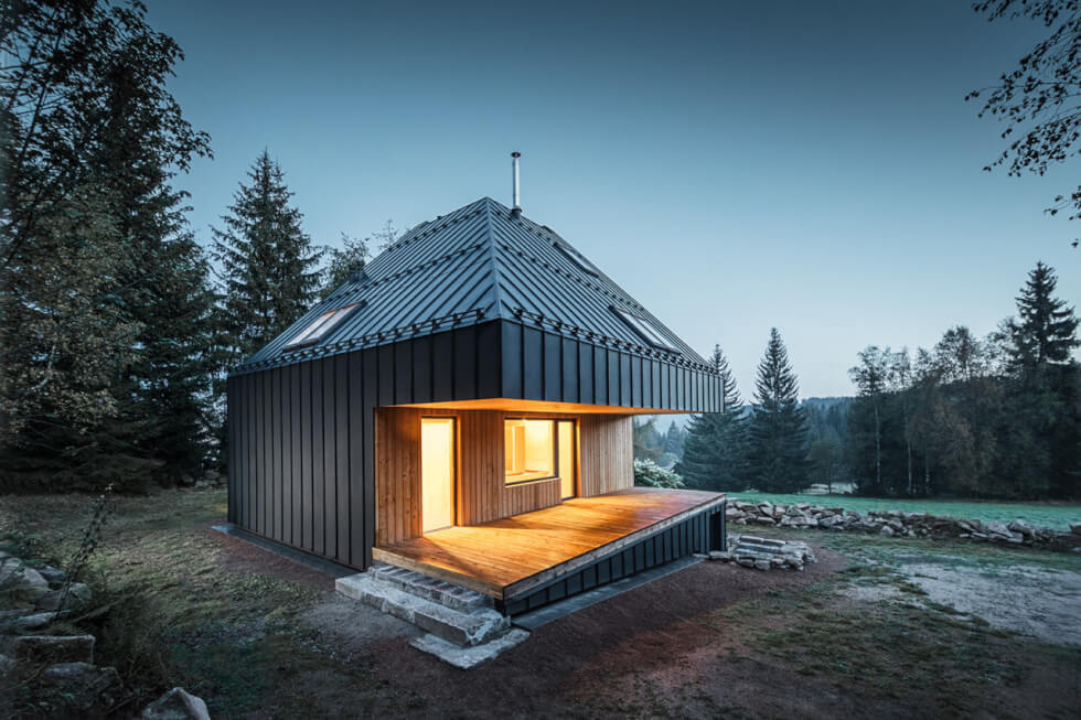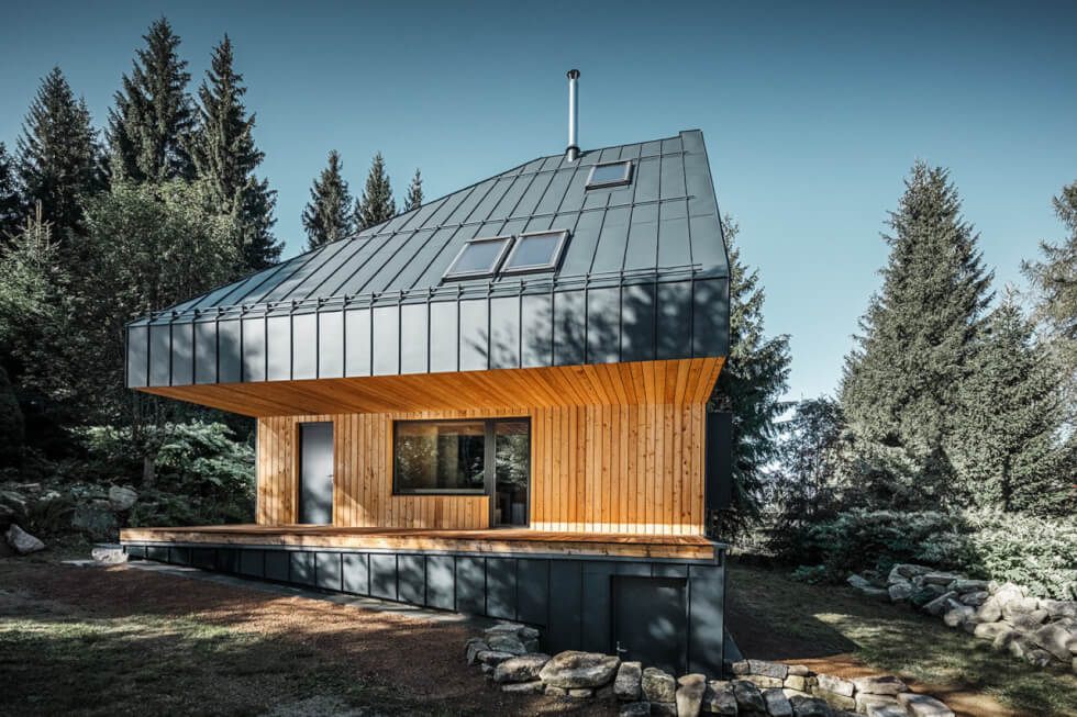 The abode sits among rocky and wooded scenery in Czech’s forest topography. It sits just a few meters from the edge of the forest and boasts an angular timber facade painted gray to match the tones of its surrounding granite and basalt rocks. New How Architects designed the chalet according to the seasonal changing local climates. The roof is at a steep angle to support snow load during the winter months.
