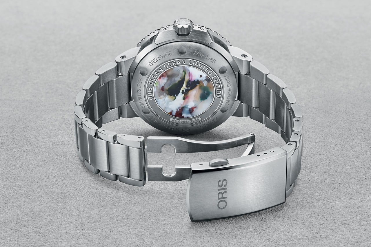 The process starts off by selecting chemically-inert and recyclable plastic waste. Next, everything is shredded into tiny bits and pieces, which are then arranged by hand and machine-pressed into a rigid sheet. Finally, another machine cuts the circular medallions out of the panel and polishes it down to fit into the case back. Overall, the Oris Aquis Clean Ocean is an exceptional version of a reliable timepiece that subtly joins a noble cause. Only 2,000 pieces of this exquisite diver’s watch will be available alongside a special box and certificate.
