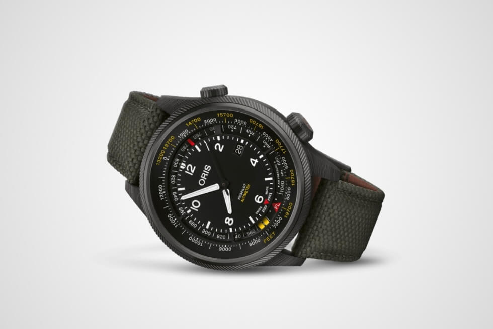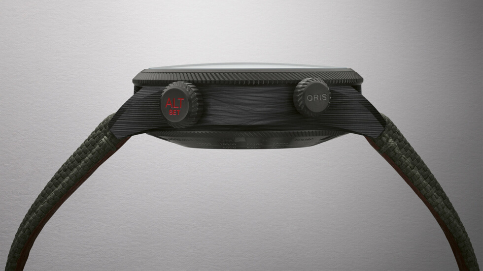 Oris’ latest, on the other hand, is a fantastic tribute to vintage flight instruments. Here we have a 47 mm case crafted out of carbon fiber and PEKK composite, which is a first for the company. These materials equate to weight savings of about 70 grams over the outgoing version.