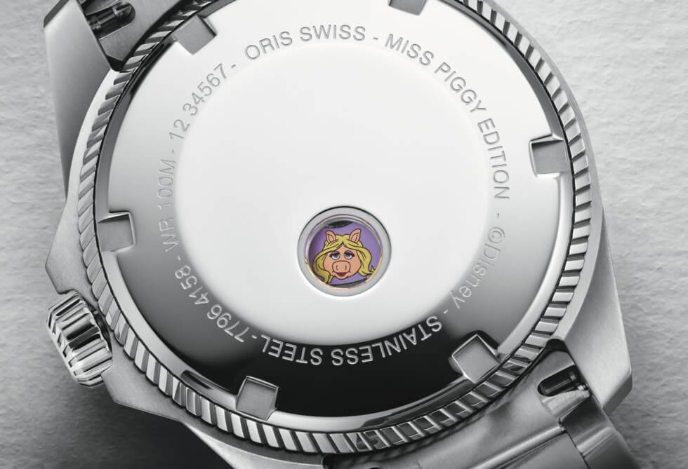 Reference 01 531 7796 4158-07 8 17 05LC is rendered in stainless steel and measures 34 mm. Oris says the construction is robust enough to receive a 10-bar water-resistance rating. The case back sports a small aperture where a portrait of the glamorous porcine puppet is visible. It sports a knurled bezel and a double-domed sapphire crystal with an anti-reflective coating.