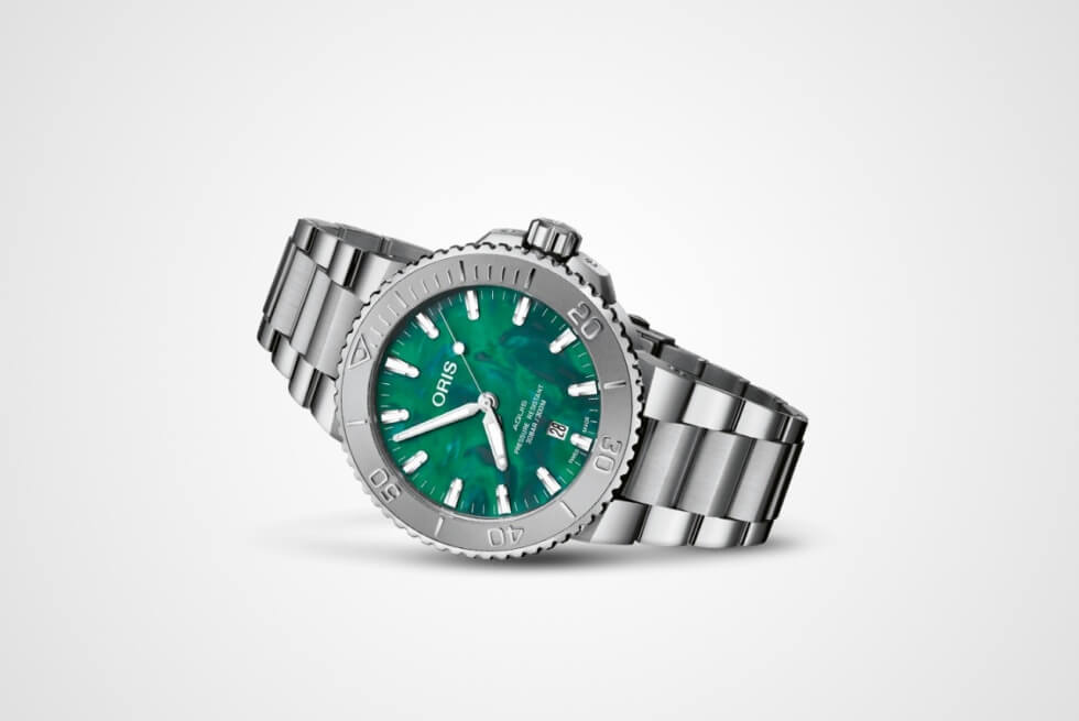 The materials are then gradually melted, hardened, and shaped into medallions just 0.3 mm thick. These become the mesmerizing backdrops for each Oris x Bracenet Aquis’ applied hour markers, indices, and hands. A date aperture is set just above 6 o’clock.