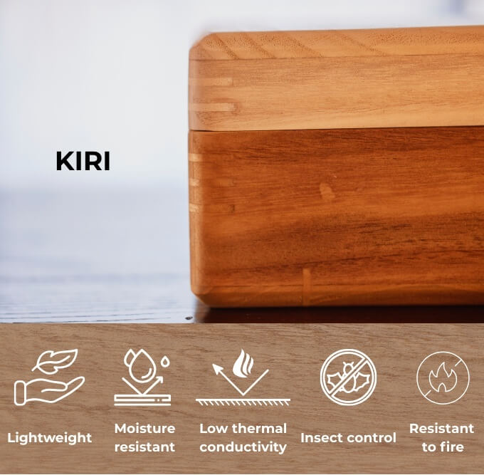 The pores within the wood also maintain a stable internal humidity that allows vapor transmission through it. Kiri is lightweight yet durable and is naturally anti-bacterial and resistant to fire and insects. Osmac used OsmoColor, a natural paint made in Germany, to give the wood its water resistance so it can be washed repeatedly with water after use.
