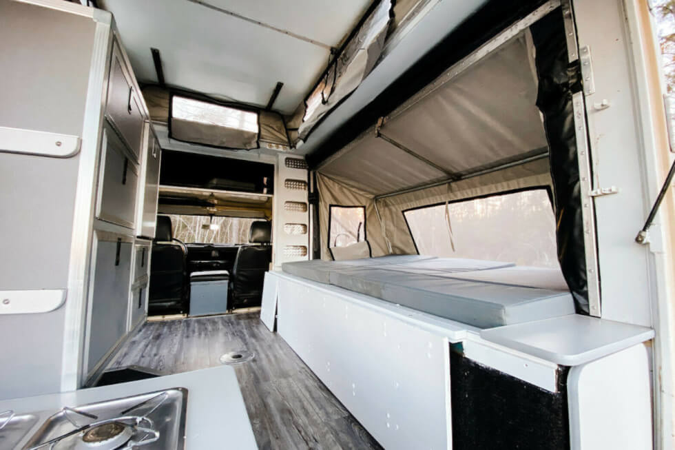 The transfer case and drivetrain have also been serviced with new driveshafts put in. Other noteworthy additions include a new suspension system, a Tuffy cubby lockbox, and more. As of this writing, the standing price for this 1990 Land Rover Defender camper is at $99,995.