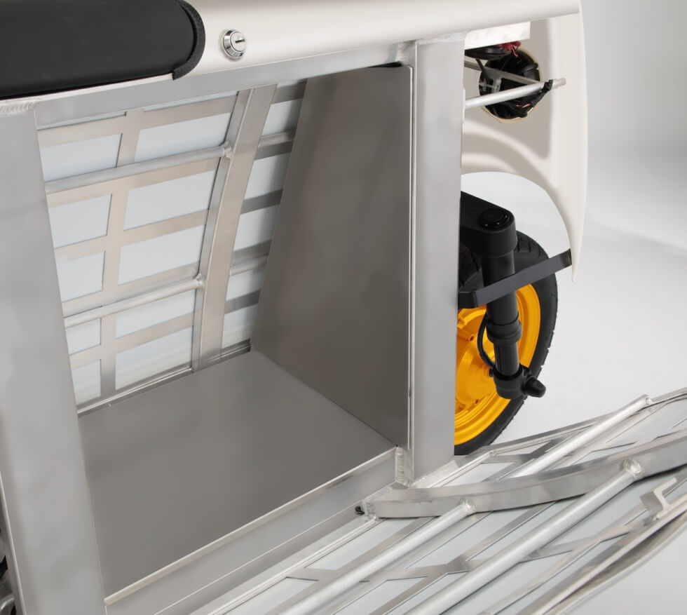 Lightfoot is the work of Otherlab and resembles a sit-down e-scooter engineered for utility. It doesn’t look that way at a glance, but the frame allocates a hollow section for storage. The designers incorporate hinges at the bottom edge of the side panels with a closure mechanism at the top.