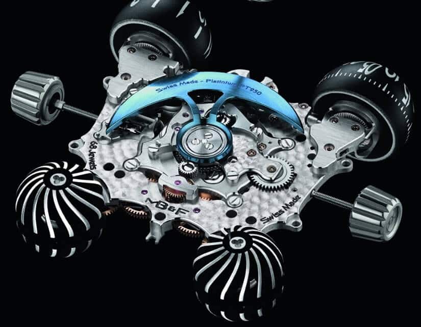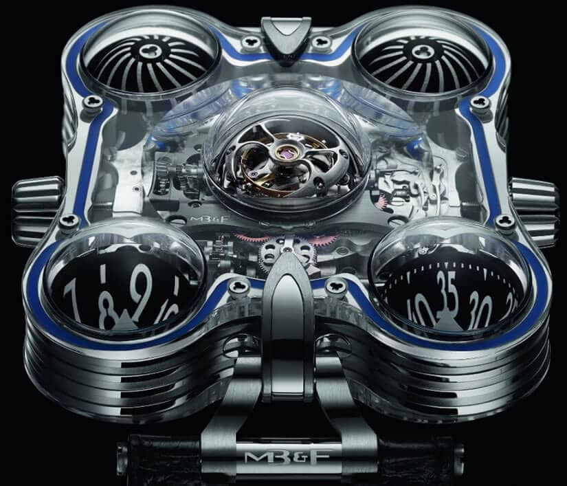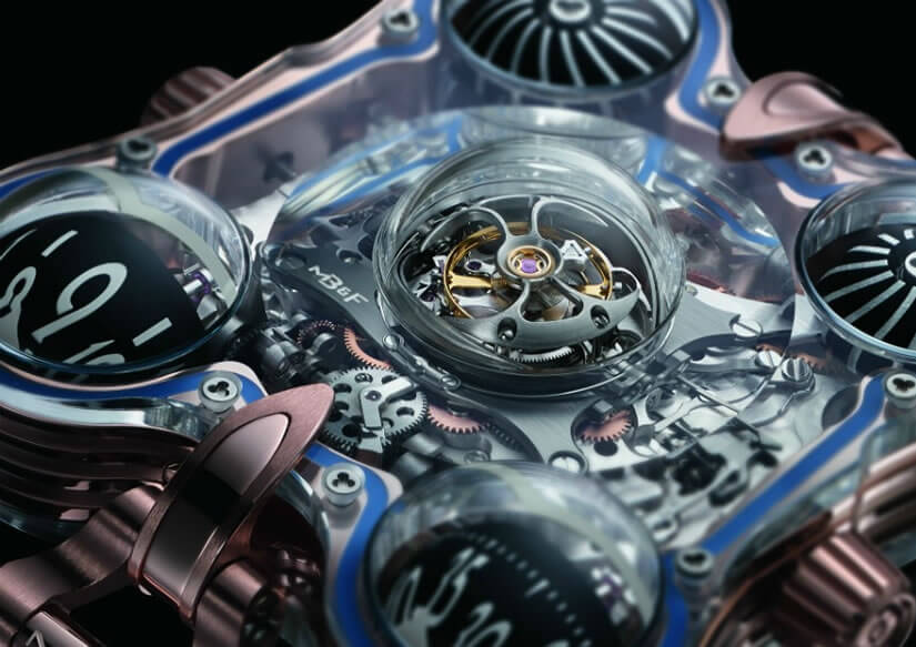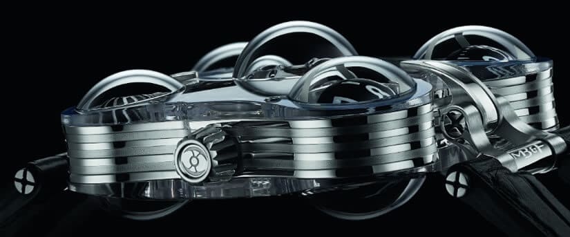 The most expensive MB&F creation to date, Horological Machine No.6 SV is a time telling stunner priced around $400,000. The ‘SV’ part of the name stands for the brand’s unique ‘sapphire vision’ design concept, first introduced in 2011. The transparent top and bottom parts of the design consist of eleven individual sapphire crystal pieces that have been masterfully glued together to show no seams or transitions.