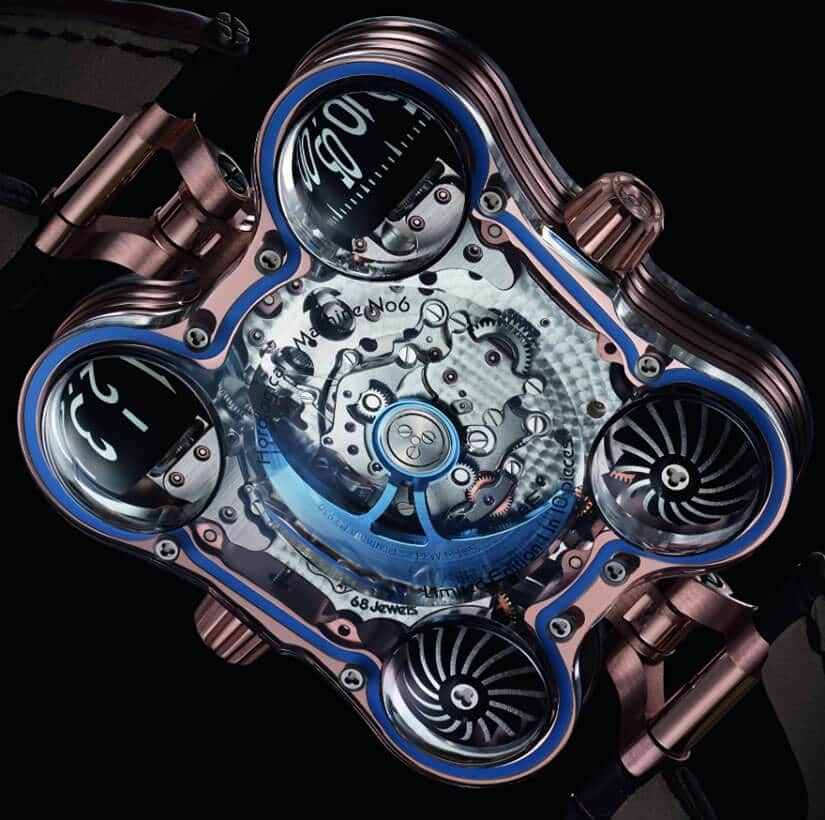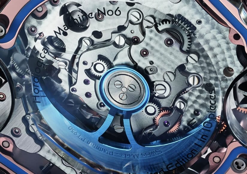 Production for the Horological Machine No.6 SV is limited to 20 pieces, half of them featuring an 18kt rose gold case (priced at $368,000), and the other half boasting a 950 platinum case ($398,000).