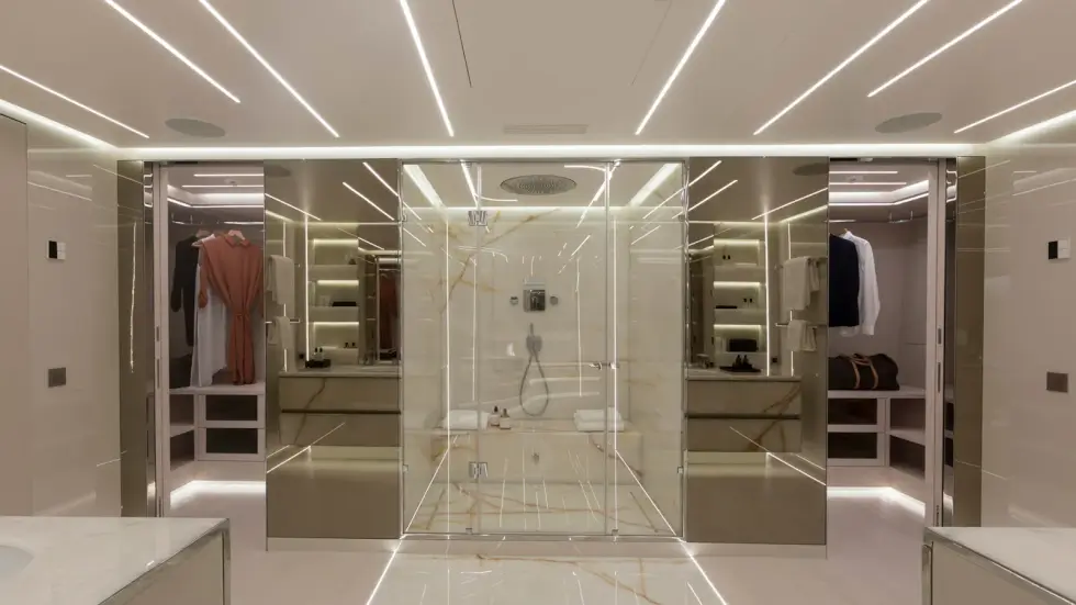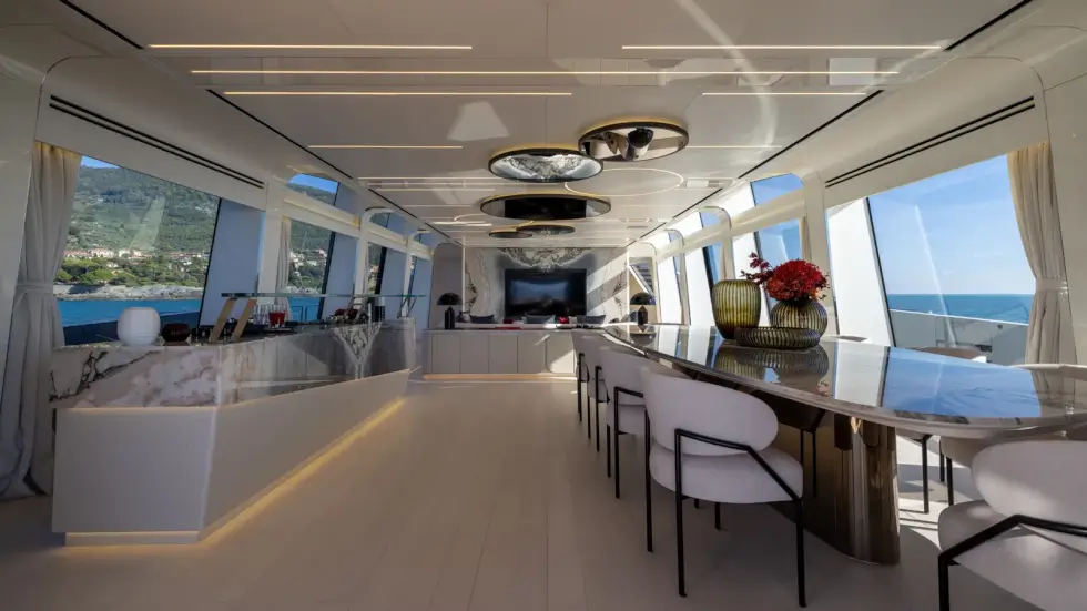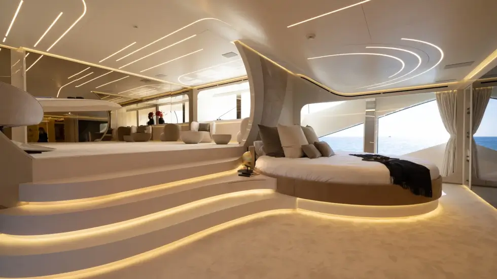 Mangusta says the tender garage can hold a 20-foot water-jet RIB with more space for PWCs and other water toys. Accommodations for guests are located on the lower deck, while the owner’s suite spans two levels for sheer opulence. The next 165 REV delivery is slated for 2026.