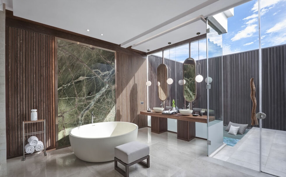 The west wing holds the master bedroom, with two additional volumes on the east wing. Park Hyatt Maldives Hadahaa says the Overwater Reef Residence is perfect for up to six people with two children. To match the natural shades of the lagoon, its interior chromatic motif features azure and verdant tones.
