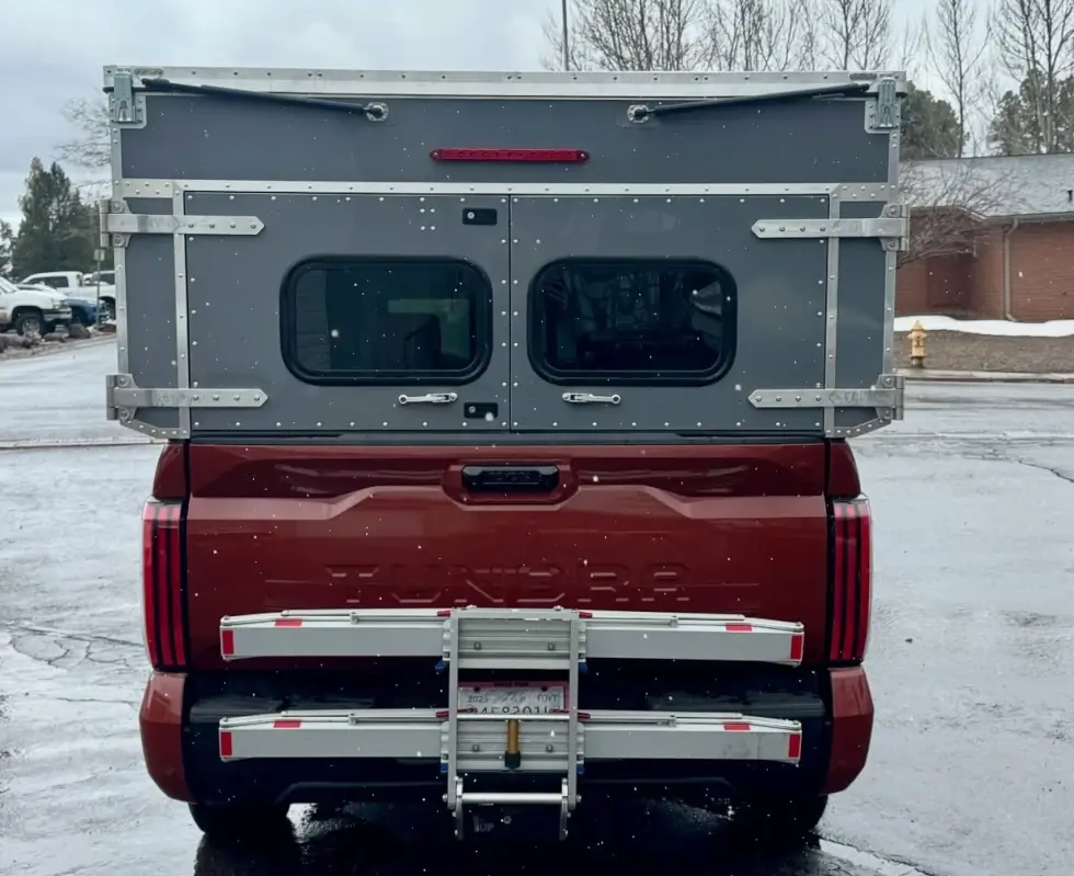 Without add-ons, the Bivy weighs approximately 230 lbs. For ventilation, we have two windows with bug netting to allow cool air in and keep the creepy crawlies out. The flip-up rear door sits flush above the tailgate and includes two locking latches. OVRLND Campers recommends the Chubby upgrade, and so do we.