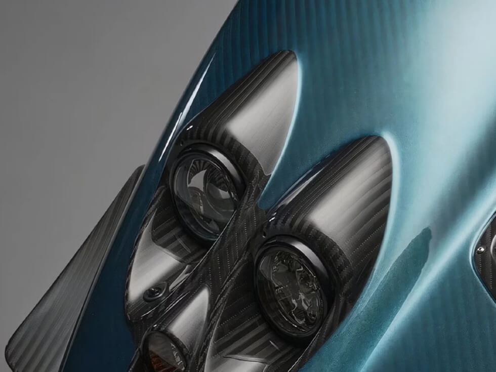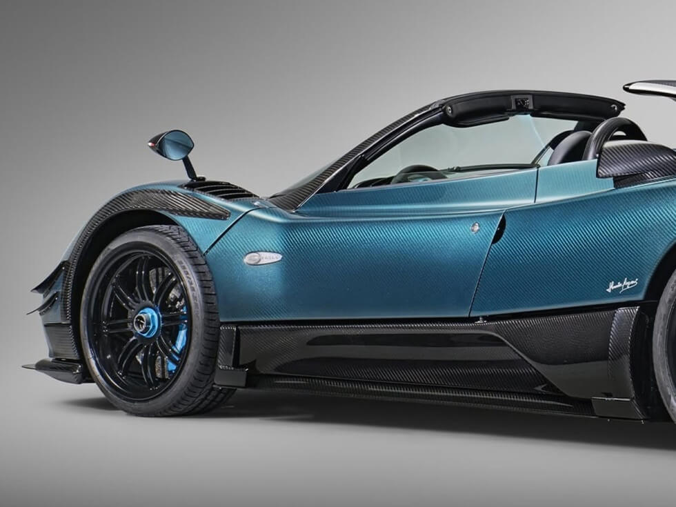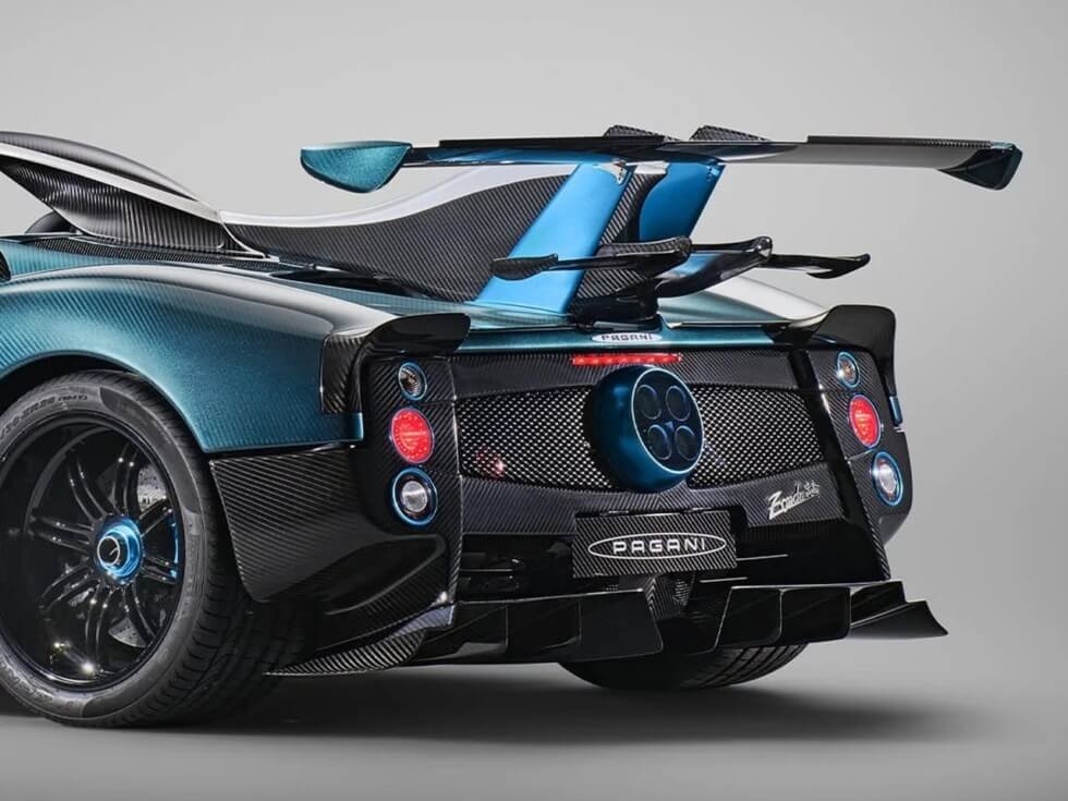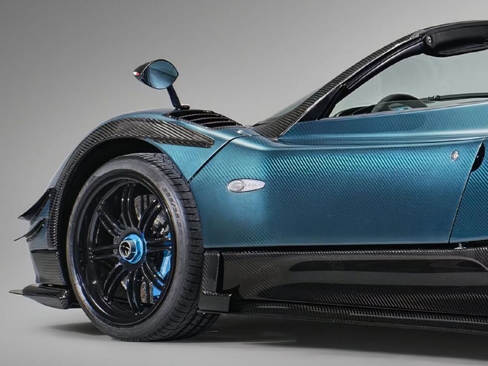 The Pagani Zonda Unico in question here is almost completely clad in carbon fiber. Even the sections in a bold blue shade still bear the distinctive weave pattern of the composite. The same hue also appears on the brake calipers, taillight surrounds, center-lock wheels, and quad exhaust tips.