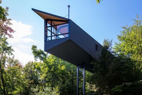 m.o.r.e. cabin rises 60 feet above the forest floor on a single steel mast, its front area cantilevers over a cliff face overlooking a lake.