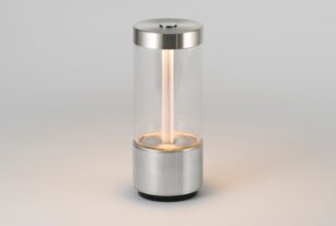 The Takeout Lamp emits a warm candle-like glow from a tubular LED housed in a cylindrical glass and runs on a rechargeable battery.