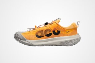Nike's ACG Mountain Fly 2 Low has a mesh upper with a toggle lace system and semi-gusseted tongue, a reinforced, elongated toe cap, React foam midsole, a lowered ankle height, thicker rubber sidewalls, and large lugs.