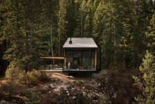 The promontory makes it seem that the Boundary Point Cabin is floating against its verdant backdrop of Douglas fir, pine, and cedar trees.