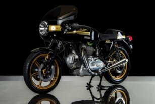 This 1979 Ducati 900 Super Sport underwent a comprehensive restoration process and flaunts a black body with gold detailing.
