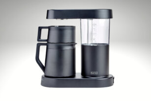 The Ratio Six Coffee Maker simulates barista pour-over using ideal heat and precisely-metered water to flow through a showerhead then to coffee grounds.