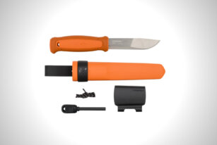 The Morakniv Kansbol with Survival Kit (S) comes with a knife, blade sharpener, sheath, and a firestarter perfect for the avid outdoorsman.