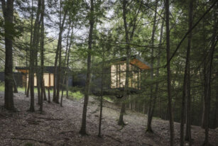 At the heart of the Cat Hill House is a glass-enclosed fitness studio that extends over the ridge that appears to float above the ground amid its steep topography.