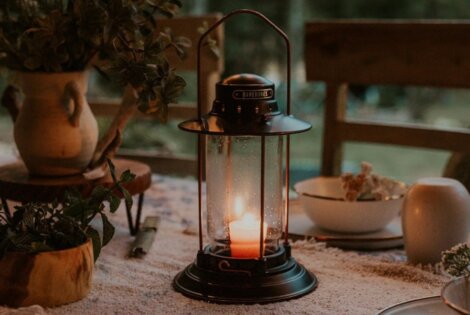 Barebones' Hurricane Lantern has a replaceable glass container, copper handle, removable base, and works with a cande or LED stick.