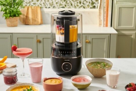 The Blender & Soup Maker MX-HG4401 makes hot soup from fresh ingredients using a heating element that reaches 100°C and a six-fin blade.