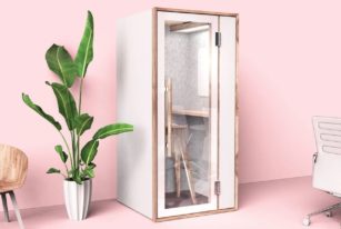 The Nook soundproof booth sits two people and comes equipped with a USB and mains socket, fans, and LED lights for comfort and convenience in work and play.