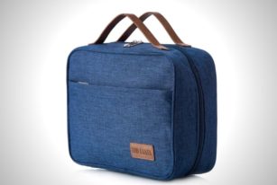 The Leo Gonta Hanging Toiletry Bag offers four zipped transparent pockets inside and an extra exterior side pocket outside in its waterproof and padded polyester construction.