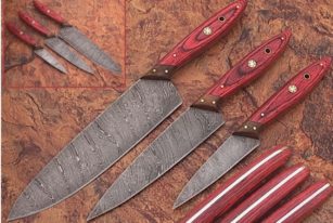 The Gladiators Guild Damascus Steel Kitchen Knives set comes in three sizes with razor-sharp blades and beautiful, red Pakka wood handles.