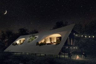 The Château-Scope treehouse sits just across the moat of France's Château de la Mothe Chandeniers castle, It provides a snow-globe effect of the historical site when viewed from the interior arches.