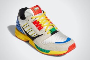 The LEGO Adidas A-ZX 8000 features LEGO's signature bold yellow, blue, and red colors and has textured plastics in place of eyelets and a LEGO-inspired dubrae.