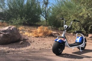 The HD Phat Electric Scooter has wide wheels for superior balance, three driving modes, and front and back suspension for a controlled and smooth ride.