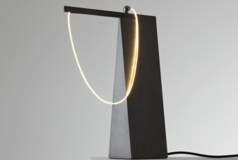 The Tangent Lamp has a light filament that illuminates with each electrical contact made between a magnetic sphere and steel block.