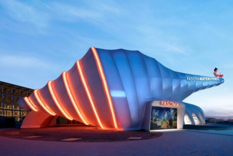 Pasona Natureverse Pavilion glows at night with its design patterned after the spiralling shell of the prehistoric ammonite marine mollusc.