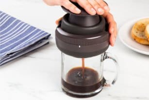 The Palmpress brews coffee like any other French press. However, it simplifies the pour-over process. Its filter cup also serves as the press handle.