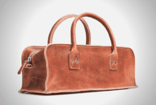 The Billykirk Tool Bag weighs 1.5 pounds but can carry a heavy load. It's crafted from 8-ounce bridle leather and nickel-plated hardware for durability.