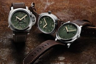 Panerai has just issued a handsome collection of three of their standard watches featuring matte forest green dials complemented with gold colored hands and indices. The Radiomir 8 Days Titanium ($12,100)…