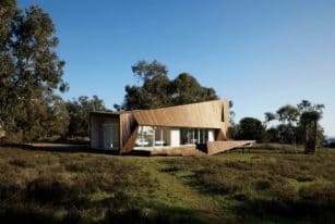 Looking as though it is being bent through strange dimensions, this dwelling explores unconventional geometric shapes while incorporating expansive views of the Pacific Ocean.