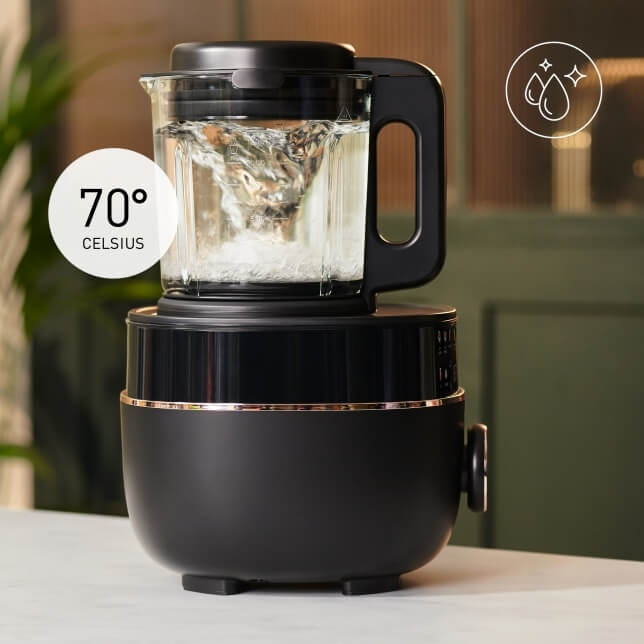 All you have to do is dump the ingredients in (peeled for vegetables or fruits of course) and Its built-in heating element, which can reach a max temp of 100°C, and its six-fin blade easily blends and cooks raw ingredients in as little as 22 minutes. Then soup stays warm for hours in its 1.2-litre glass jug via the Keep Warm function.